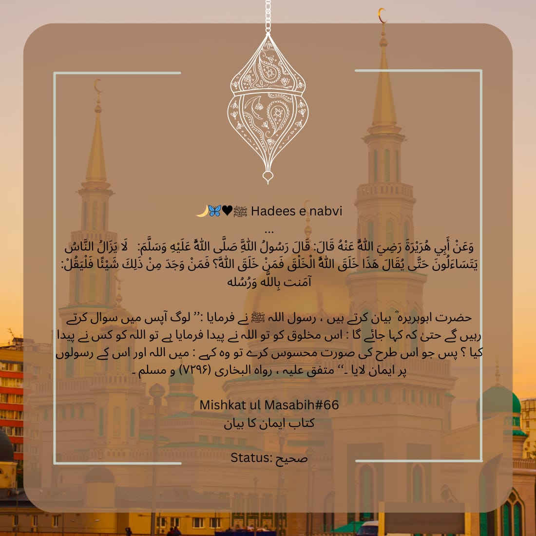 Hadees e nabvi ﷺ♥️🦋🌙 … وَعَنْ أَبِي هُرَيْرَةَ رَضِيَ اللَّهُ عَنْهُ قَالَ: قَالَ رَسُولُ اللَّهِ صَلَّى اللَّهُ عَلَيْهِ وَسَلَّمَ: لَا يَزَالُ النَّاسُ يَتَسَاءَلُونَ حَتَّى يُقَالَ هَذَا خَلَقَ اللَّهُ الْخَلْقَ فَمَنْ خَلَقَ اللَّهَ؟ فَمَنْ وَجَدَ مِنْ ذَلِكَ شَيْئًا فَلْيَقُلْ: آمَنت بِاللَّه وَرُسُله حضرت ابوہریرہ ؓ بیان کرتے ہیں ، رسول اللہ ﷺ نے فرمایا :’’